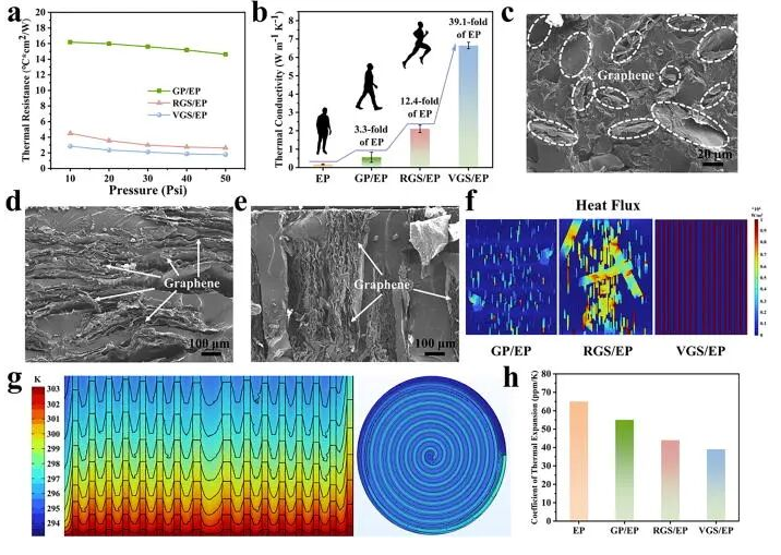 图2:(a) 不同压力下各种复合材料的热阻。(b) 纯环氧树脂(EP)与石墨烯基复合材料的热导率比较。(c) GP/EP、(d) RGS/EP和(e) VGP/EP复合材料的横截面扫描电镜(SEM)形貌。(f) 通过有限元模拟得到的复合材料热流分布。(g) 通过有限元模拟得到的VGS/EP复合材料的温度分布。(h) 纯环氧树脂(EP)和石墨烯基复合材料的热膨胀系数。