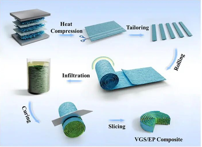 为了提升环氧树脂复合材料的热管理能力,受年轮蛋糕结构的启发,上海大学等研究团队提出了一种简单、可规模化且环境友好的制备工艺。该工艺将未经任何化学修饰的石墨烯条带(GS)集成到组装好的石墨烯纸中,并通过滚动切割法制备了具有年轮状结构的垂直排列石墨烯条带/环氧树脂(VGS/EP)复合材料。取向的石墨烯作为直接的导热路径,能够有效地沿该路径传递热量,从而提高复合材料的导热性能。