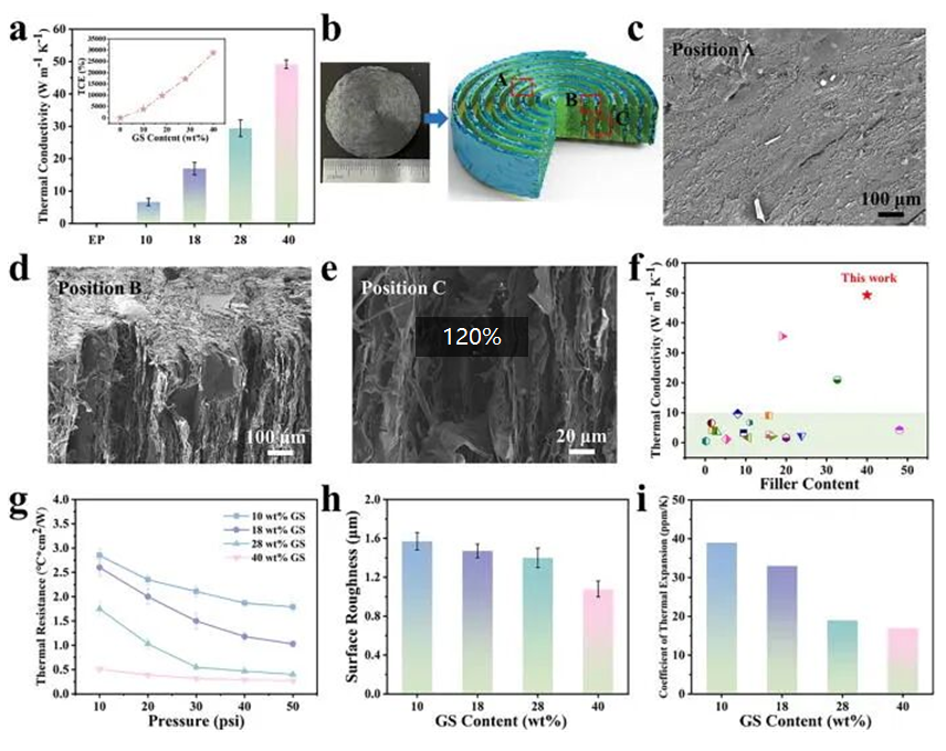图3:(a) VGS/EP复合材料的热导率及其导热增强系数(TCE)。(b) VGS/EP复合材料的照片和示意图。(c)~(e) 相应的扫描电镜(SEM)图像,展示了VGS/EP复合材料的微观结构。(f) VGS/PE复合材料与其他已报道复合材料的热导率比较。(g) 不同GS含量下VGS/EP复合材料在不同压力下的热阻。(h) 不同GS含量下VGS/EP复合材料的表面粗糙度。(i) 不同GS含量下VGS/EP复合材料的热膨胀系数(CTE)。